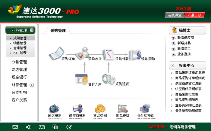 《速达3000G-PRO商业版》集进销存、POS、财务、CRM为一体的中小企业管理软件系统。系统采用导航式界面,易学易用、功能强大,是帮助中小企业规范经营管理、财务管理的有效工具。系统支持局域网/互联网多用户应用,实现异地多机构、多店面、多仓库等远程应用,支持Android移动终端应用,数据实时同步,安全、稳定、高效、易维护,特别适合中小企业使用。