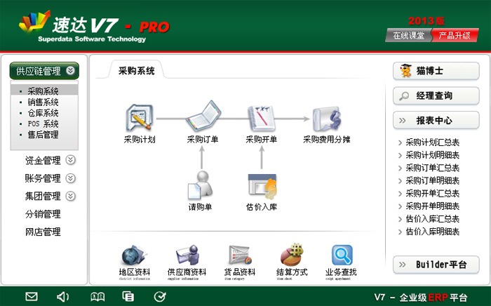 《速达V7-PRO-商业版》作为高端ERP管理平台,特别适合大中型企业使用。平台全面实现供应链业务管理、资金管理、财务管理、客户关系管理、人力资源管理、办公管理、异地分销、远程配送、多机构集团化管理。平台通过强化业务流程控制,多级审批管理,有效地帮助企业实现业务管理、财务管理的制度化。平台科学地融入Builder-Ⅲ二次研发工具,真正实现了产品平台化,满足企业管理个性化需求,全面提升企业管理的能力。