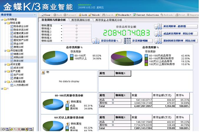 金蝶K/3商业智能系统面向中高级企业管理者,结合企业管理的关键绩效指标体系,提供灵活的指标监控、报表查询和集团综合分析等功能,同时通过多维图形展示和多种预警方式等信息工具,帮助企业管理者及时、直观地了解企业各环节的运行状况,实时发现企业经营中的异常,快速做出决策,把握企业未来增长和盈利的机会。该系统基于K/3财务、供应链、制造等系统之上,为企业提供更完整、全面的企业应用解决方案