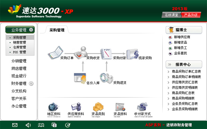 《速达3000G-XP商业版》集进销存、POS、财务、CRM、OA为一体的中小企业管理软件系统。系统采用导航式界面,易学易用、功能强大,是帮助中小企业规范经营管理、财务管理的有效工具。系统支持局域网/互联网多用户应用,实现异地多机构、多店面、多仓库等远程应用,支持Android移动终端应用,数据实时同步,安全、稳定、高效、易维护,特别适合中小企业使用。