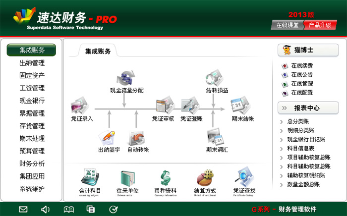 《速达财务G-PRO》完全符合国家现行会计制度标准。功能强大、易学易用。产品集财务管理、出纳管理、票据管理、工资管理、固定资产管理、存货管理、坏账管理、预算管理、合并报表、自定义报表于一体。特别适合中小企业使用。